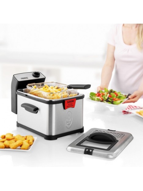 La friteuse Princess 183001 Superior Deep Fat est la friteuse idéale si vous aimez que votre poisson et vos frites soient prêts en un instant. Il ne faut que cinq minutes pour chauffer l'huile grâce à sa puissance élevée de 3 200 W. En outre, vous n'aurez plus à vous soucier de restes d’aliments brûlés grâce à la zone froide et au filtre de sécurité innovant qui empêche les projections d'huile et la surcuisson. Le filtre peut également être utilisé pour filtrer l'huile et la garder propre beaucoup plus longtemps.